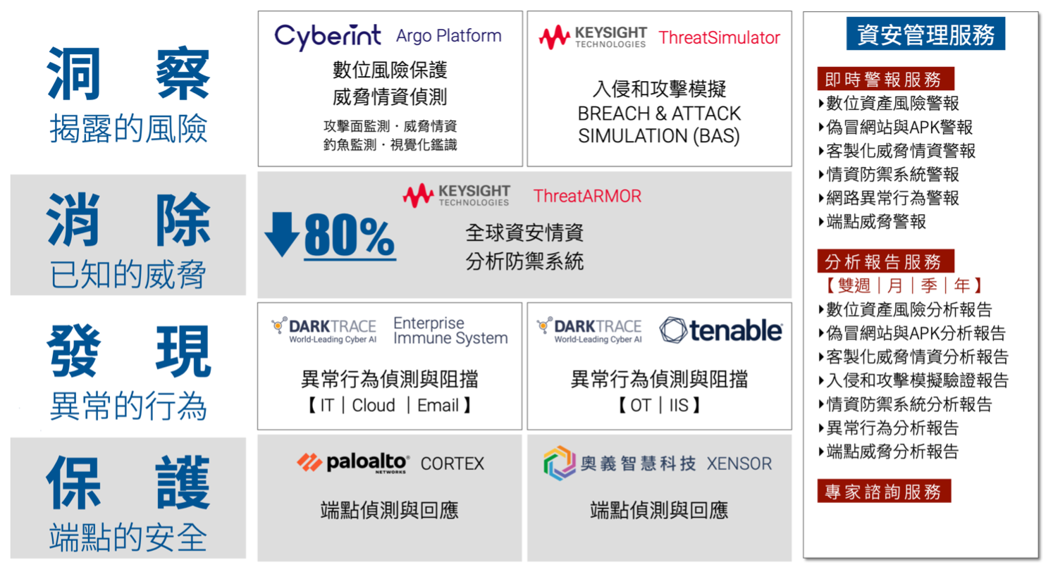 - 資安管理服務需搭配 Cyberint Argos 或 KEYSIGHT Threat Simulator 或 KEYSIGHT ThreatARMOR 或 Darktrace 或 Paloalto CORTEX 或 奧義端點防護。