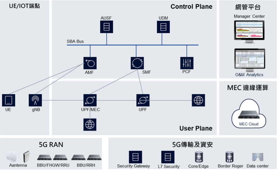 我們依據場域範圍提供不同距離覆蓋,從室內到室外可混合不同類型的基站。可適用於任何產業和場域,符合持續增長的網路規模和業務應用。網路傳輸、MEC運算、5G核網、管理平台。滿足全覆蓋網路架構,強大簡易工具讓管理人員一目了然,端到端的安全防禦,讓用戶安心使用網路服務無須擔心攻擊。